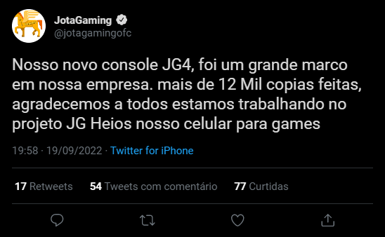 Muito obrigado a Deus e a todos , nosso console JG4 bateu um recorde de copiar 12 Mil copias feitas, sem dúvidas esse foi nosso maior recorde, estamos focados no JG Heios nosso celular gamer, que será custo beneficio para todos, em nosso planejamento deve ser lançado ainda esse ano. JG5 está previsto para Dezembro, caso ocorra atrasos, possívelmente haverá adiamente para 2023